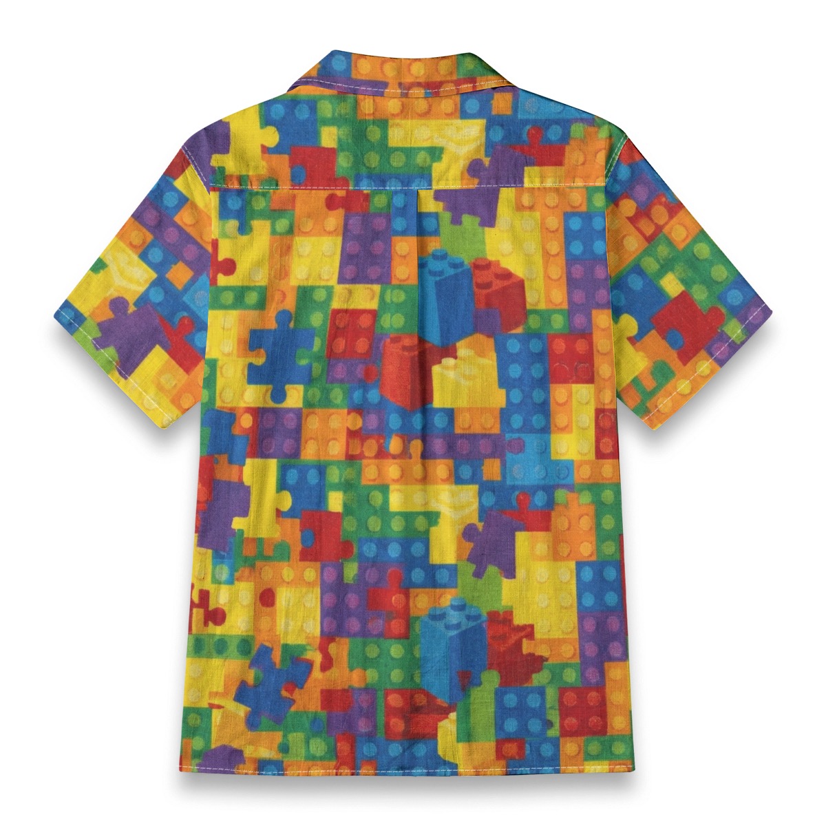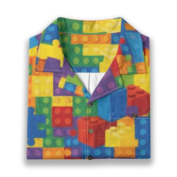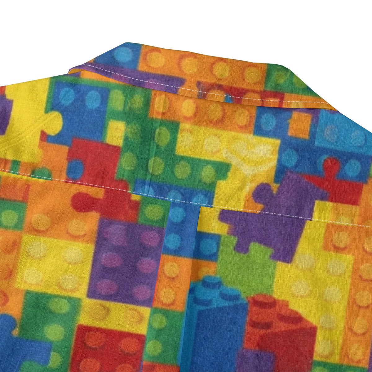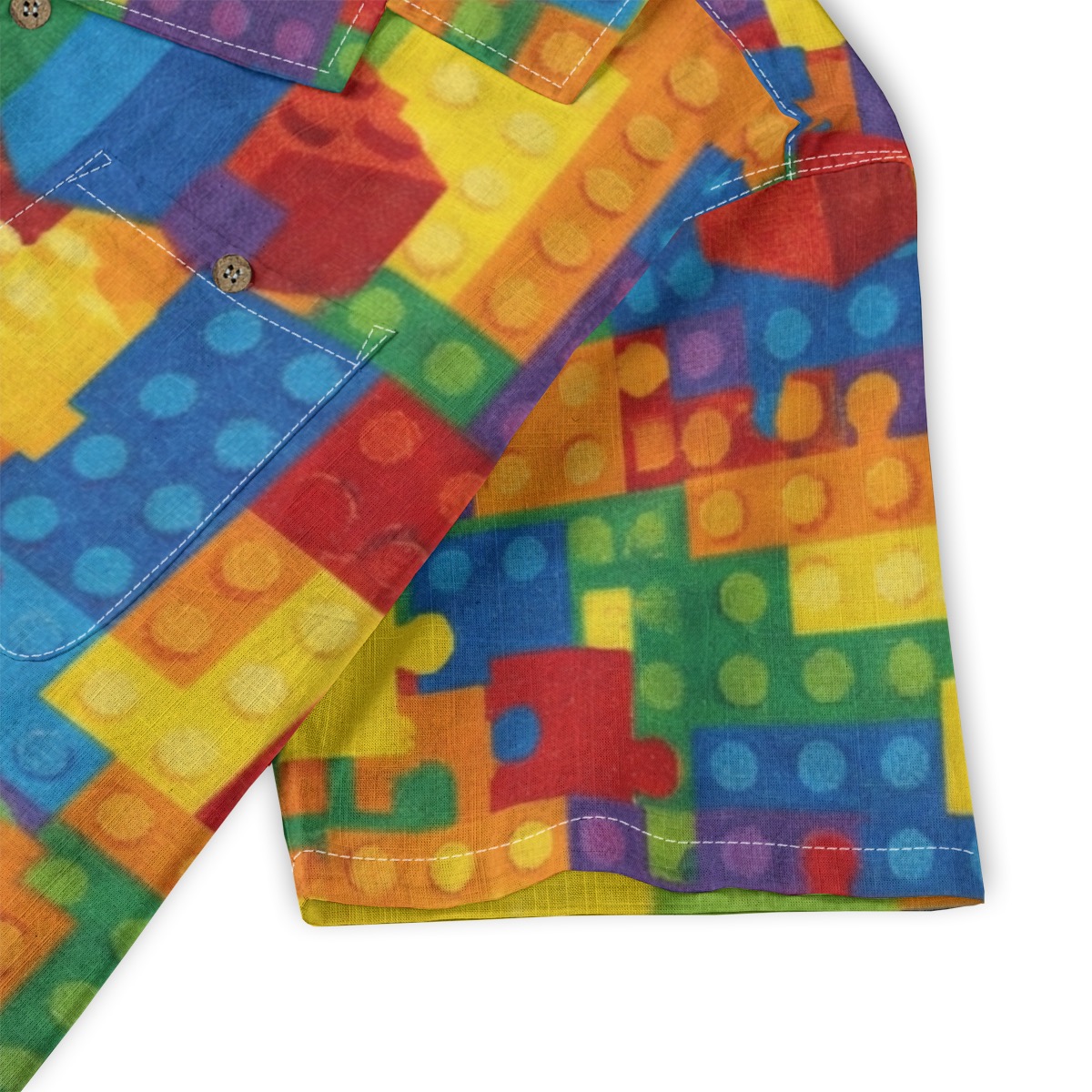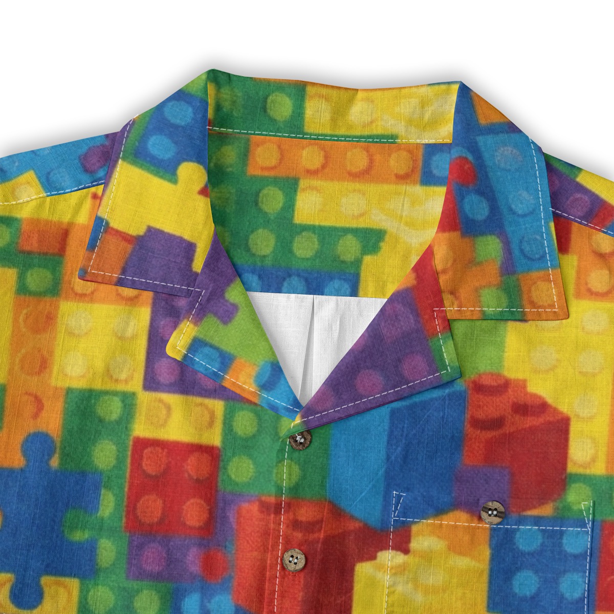Make a bold and playful statement with this vibrant puzzle brick–inspired Hawaiian shirt.