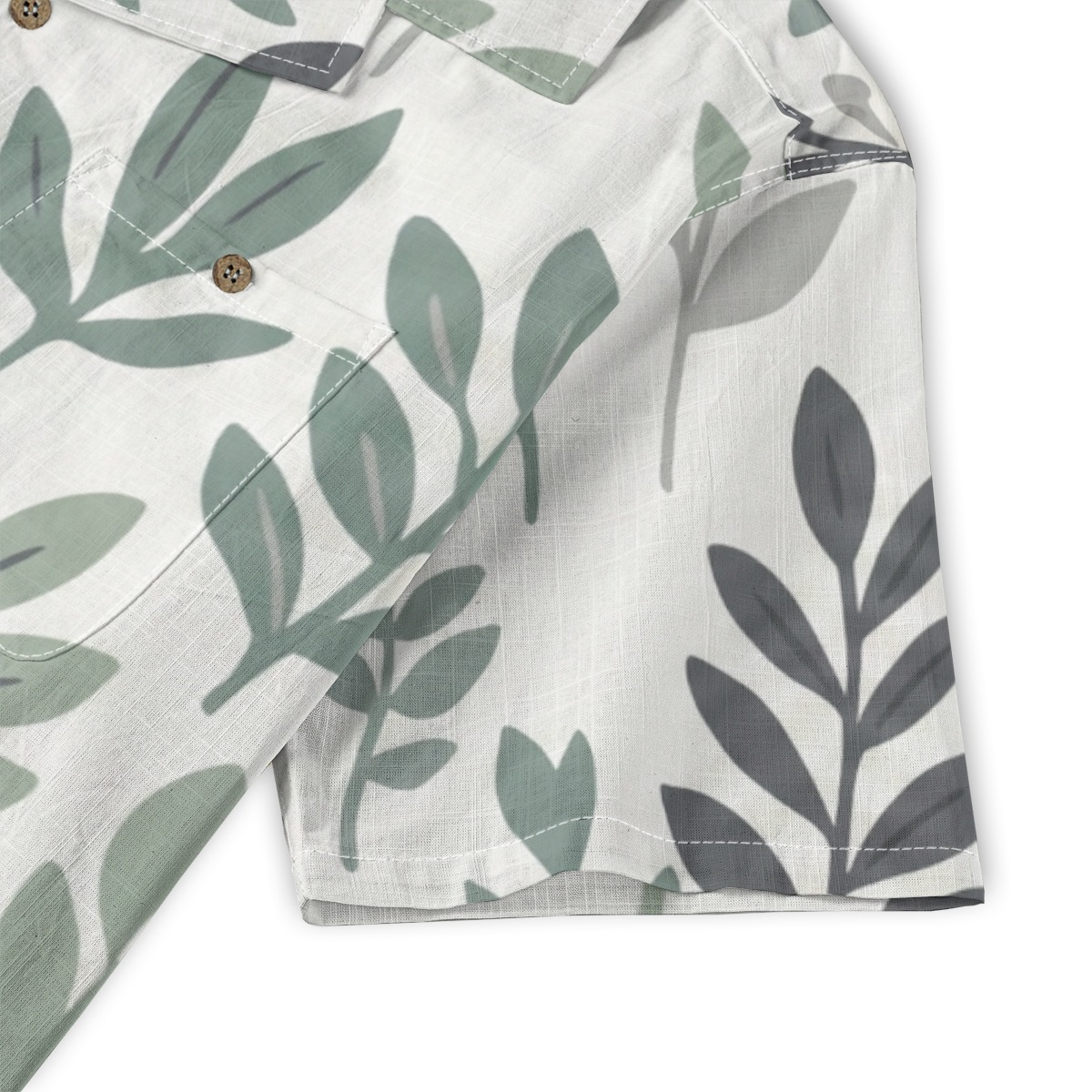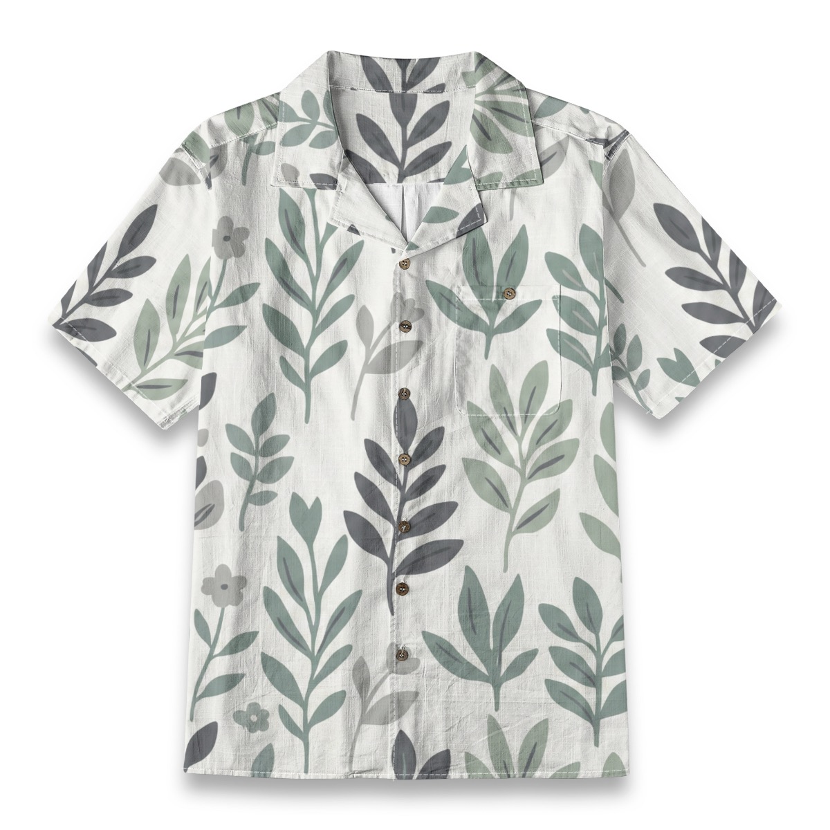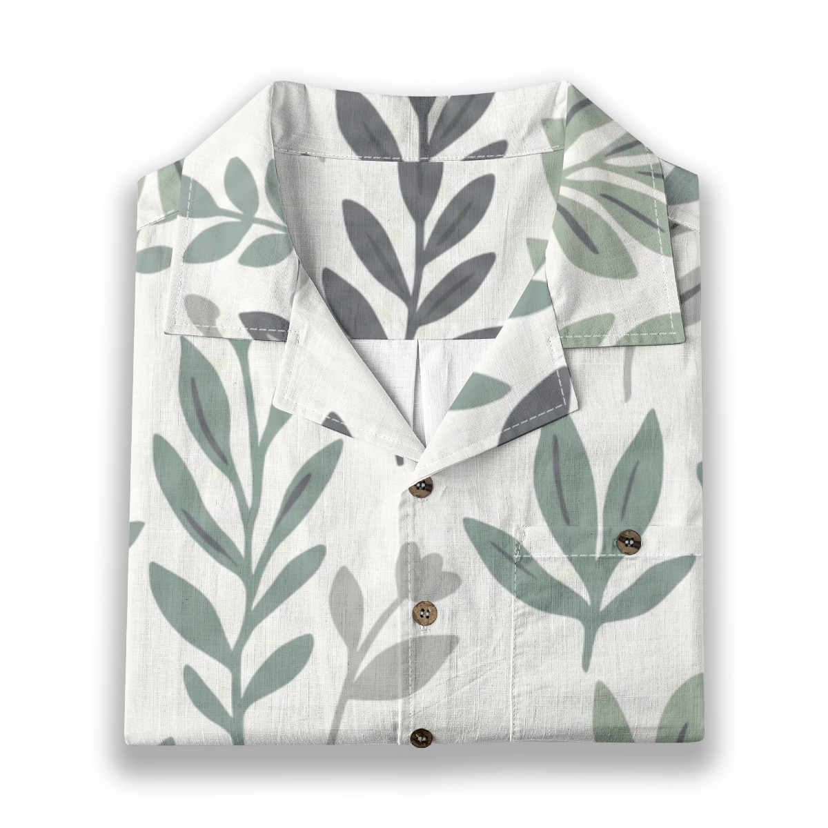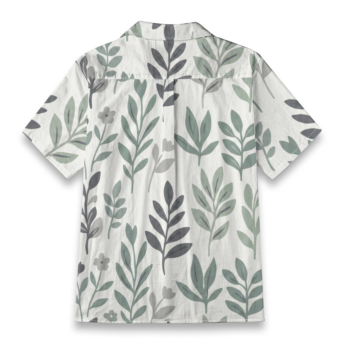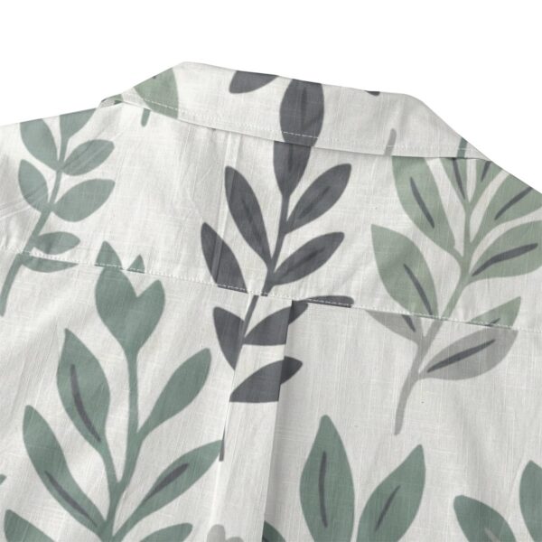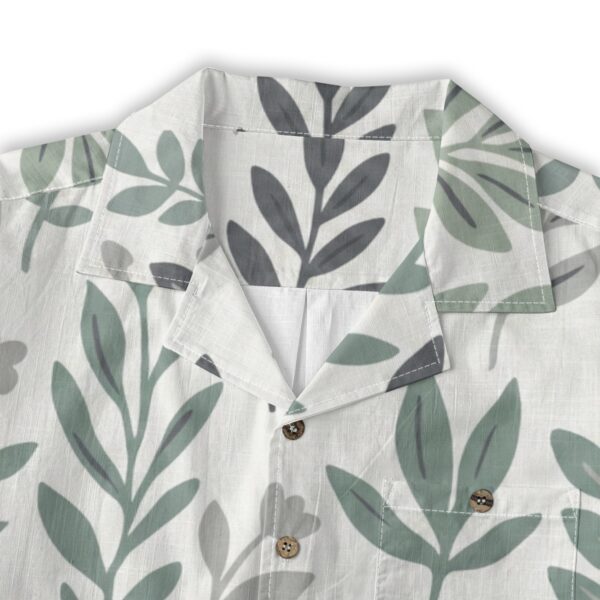 This minimalist botanical Hawaiian shirt features a repeating leaf pattern in calming shades of sage green and soft gray.