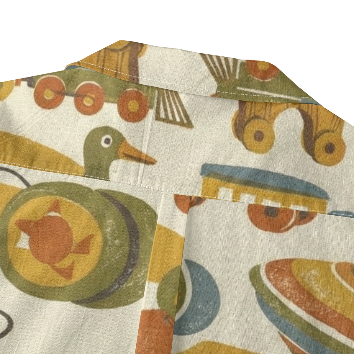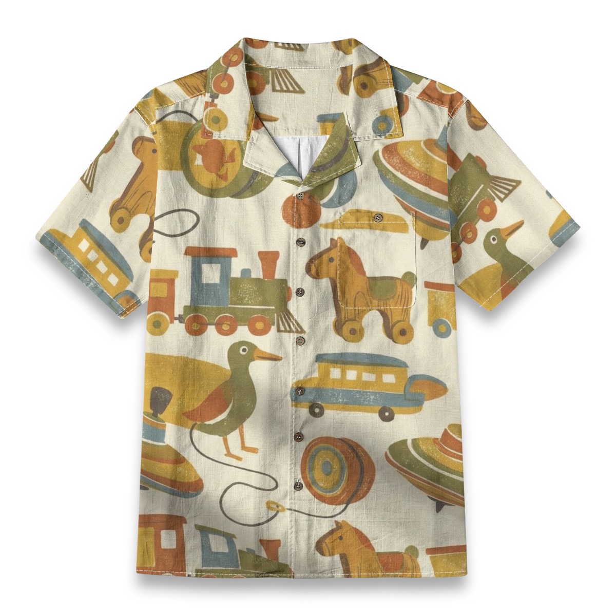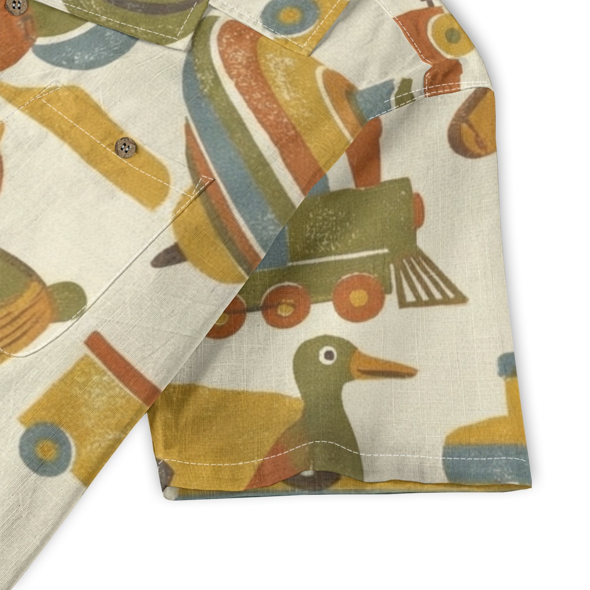 Celebrate timeless childhood charm with this vintage wooden toy–inspired Hawaiian shirt.