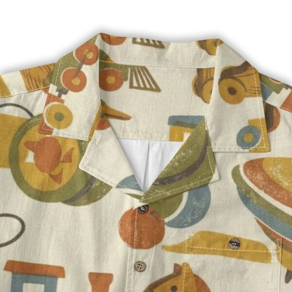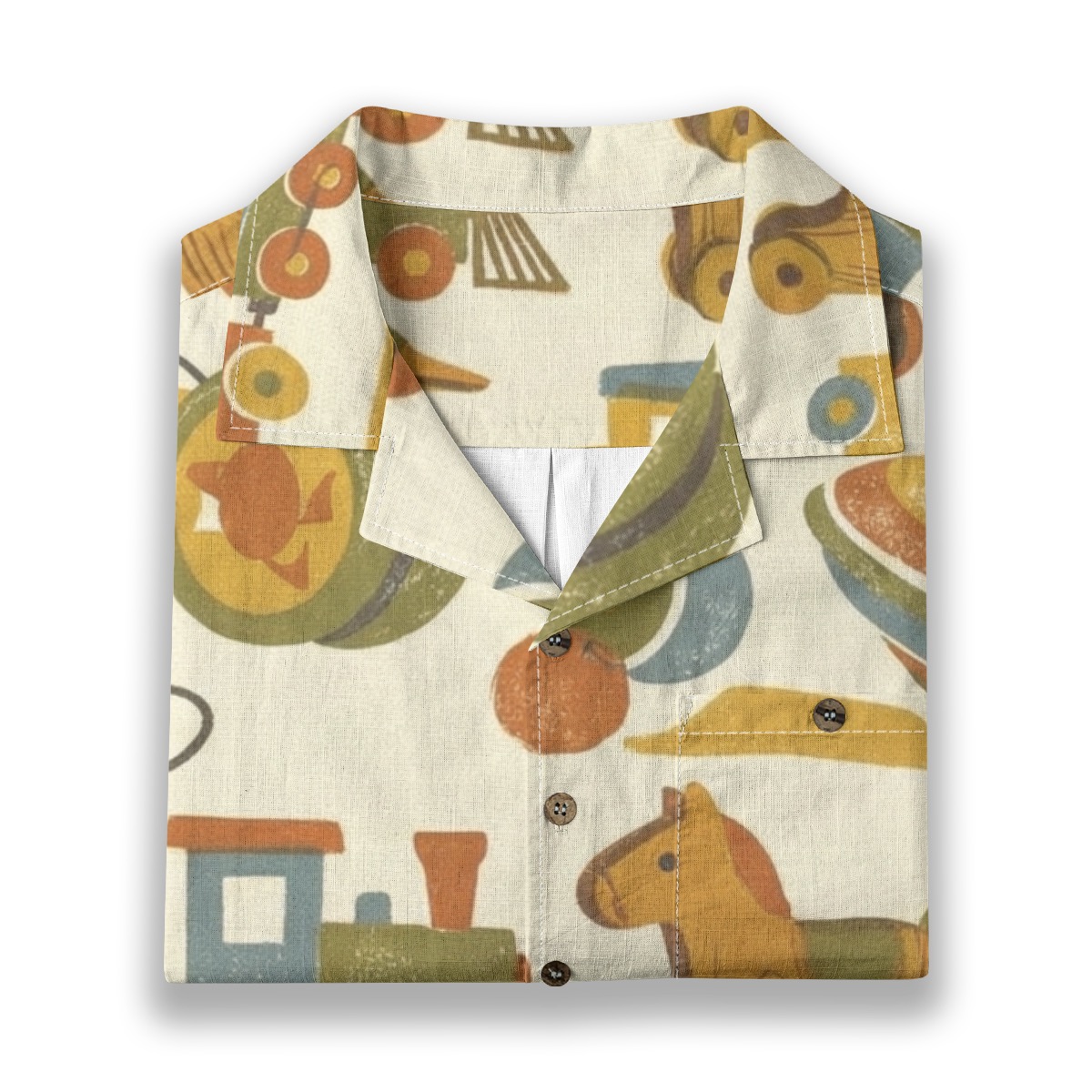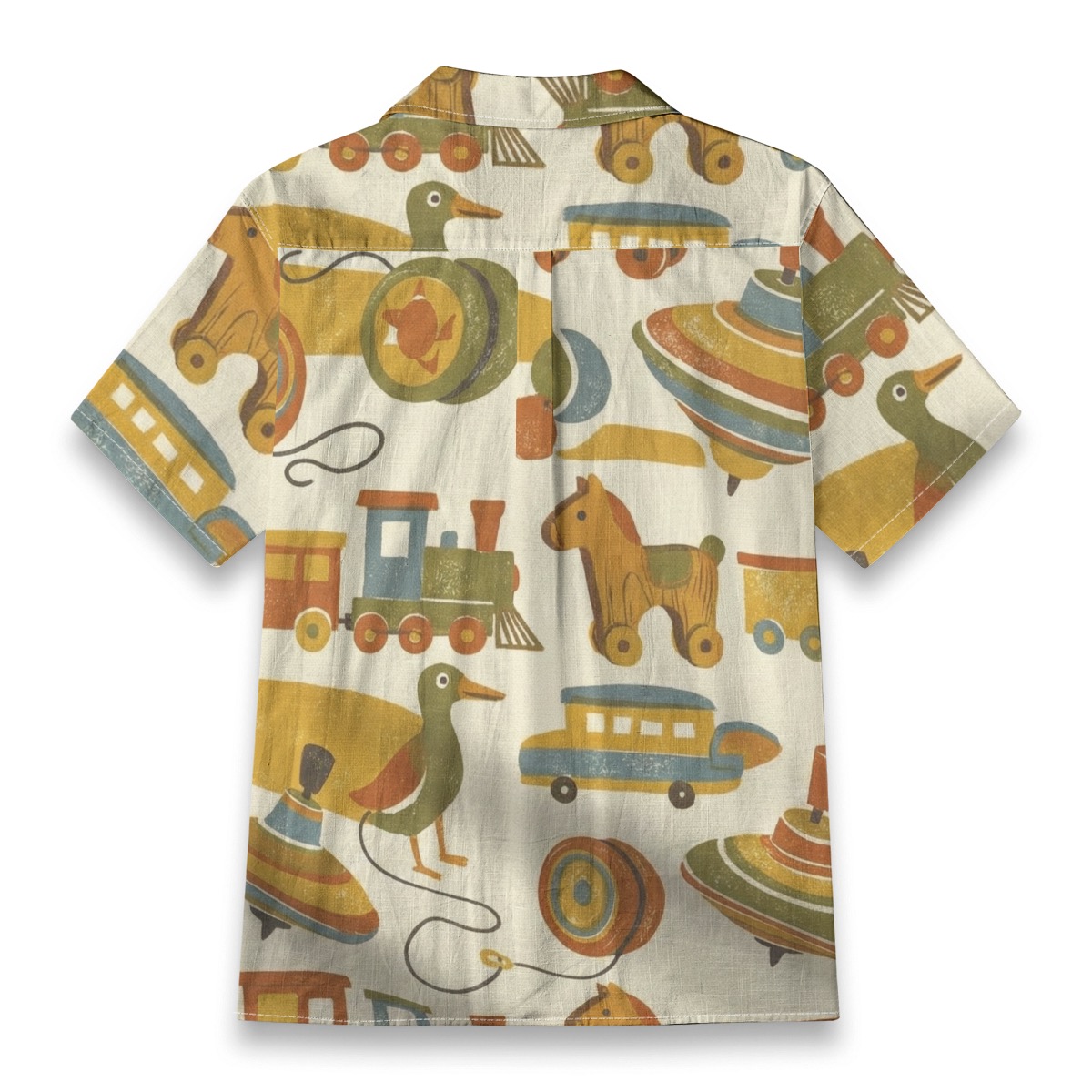 Celebrate timeless childhood charm with this vintage wooden toy–inspired Hawaiian shirt.